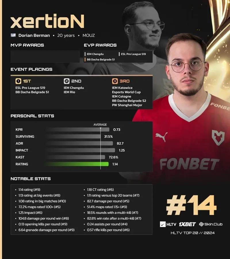 Доріан«xertioN»Берман, член реєстру MOUZ у Counter-Strike 2, зайняв 14 місце в престижному списку HLTV.org найкращих гравців 2024 року. Про це було повідомлено на офіційному веб-сайті порталу та в соціальних мережах.
