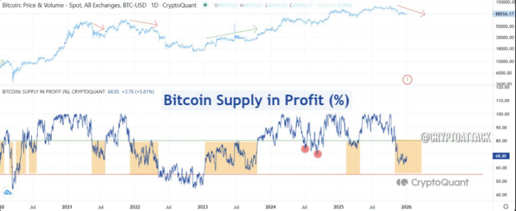 Поточна ціна біткоїна коливається в районі $90 000, закрившись вчора на позначці $90 106,76, що свідчить про стабілізацію після волатильного 2025 року. Трейдери очікують потенційного "ювілейного ралі", оскільки історично січень часто приносить позитивний імпульс для BTC. Однак внутрішні показники ланцюжка малюють обережну картину. Індикатор Supply in Profit (%) - це метрика, яка вимірює частку пропозиції BTC, що приносить прибуток, порівнюючи поточну ціну з ціною останнього руху монети. Наразі цей показник становить 68,85%, що означає, що ринок перебуває в перехідній фазі (55%-80%), характерній для пізніх стадій циклу. Це не короткострокова корекція, а тривале зниження протягом декількох місяців, починаючи з жовтня 2024 року, що сигналізує про накопичену втому ринку. Внутрішні індикатори поступово слабшають, а макроекономічні умови - збереження геополітичних ризиків, зростання привабливості активів-притулків, таких як золото та державні облігації, продовжують тиснути на ризикові активи, в тому числі і на криптовалюти.