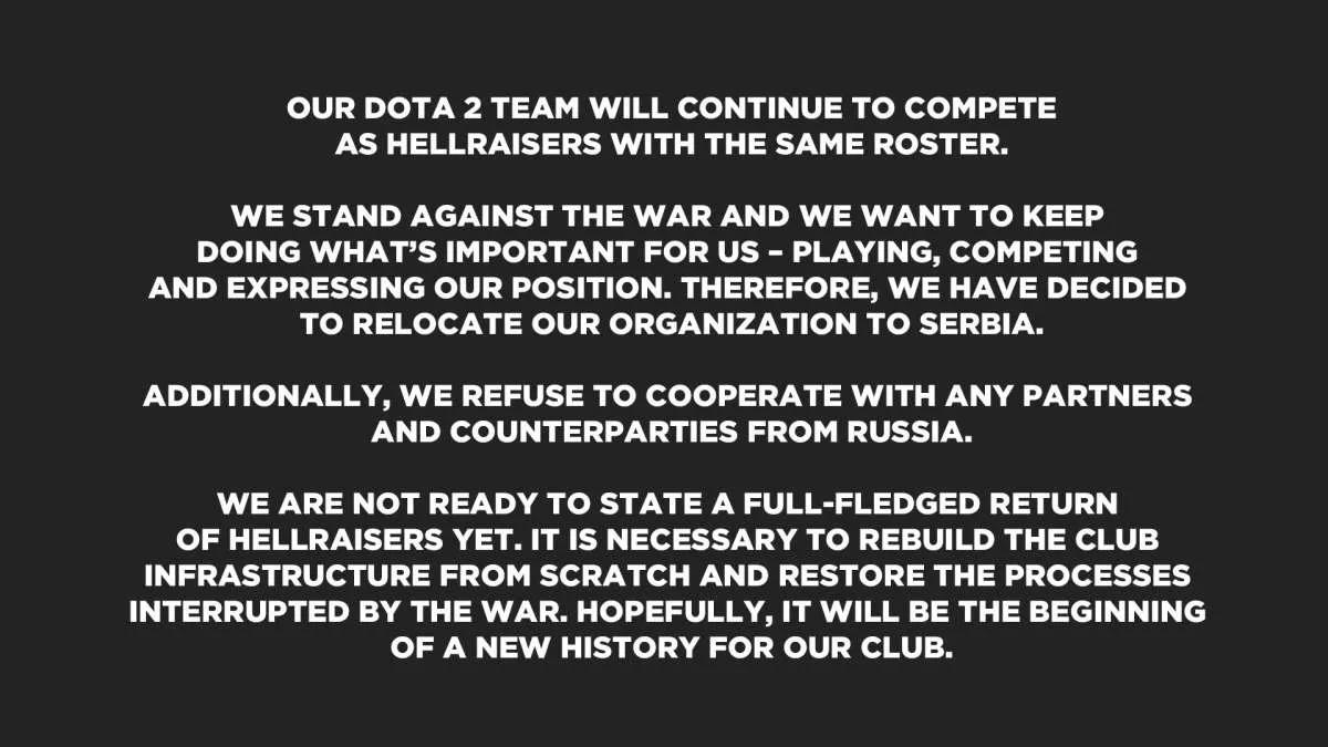 The Dota 2 team will continue playing under the HellRaisers tag with the same roster. We oppose war and want to be able to do without restrictions what unites us - to play, to compete, to express our position. Therefore, we decided to move the squad to Serbia.